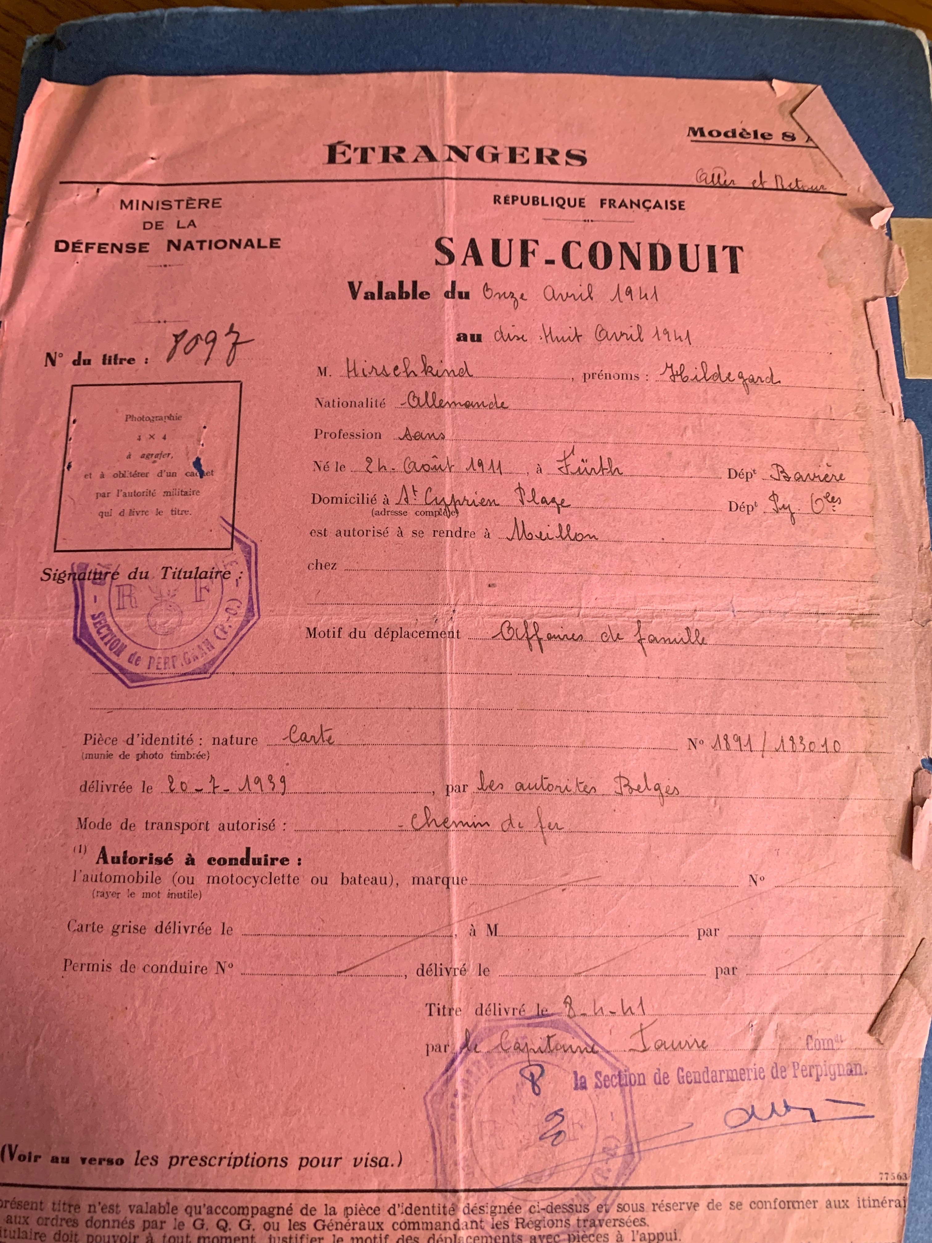- Hilde, meanwhile, was forced to remain in Perpignan with Walter until receiving this safe passage in April 1941, which enabled her to finally reunite their family after six months of constant effort.
