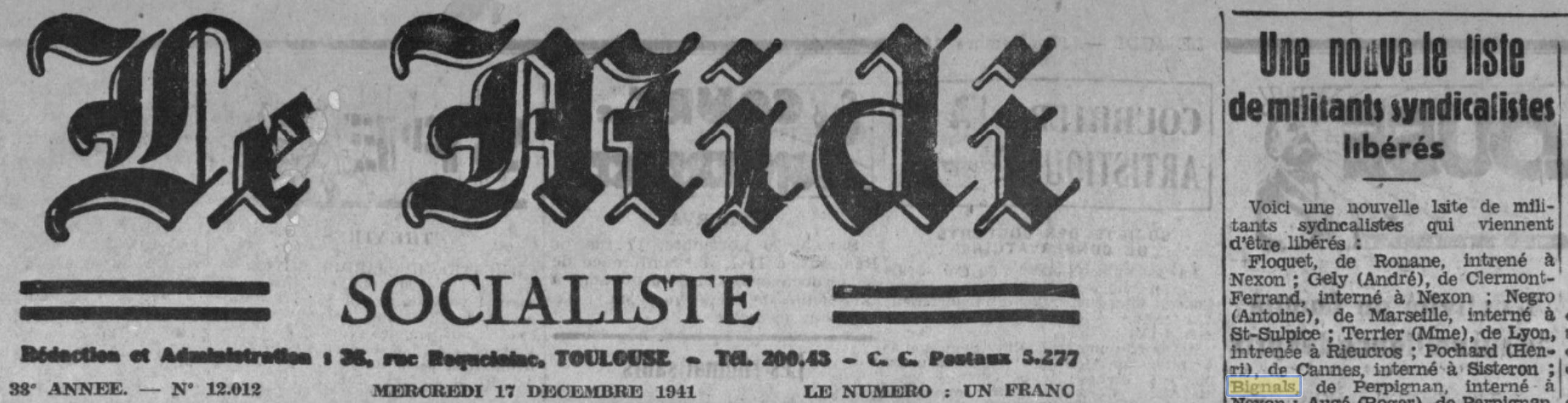 Bignals was active in the labor movement – I know this thanks to historian Dominique Piolet, who unearthed a newspaper article from the newspaper Le Midi Socialiste, which named Bignals among a list of union organizers who in December 1941 were freed from an internment camp at Nexon, in the Haute-Vienne region of France.